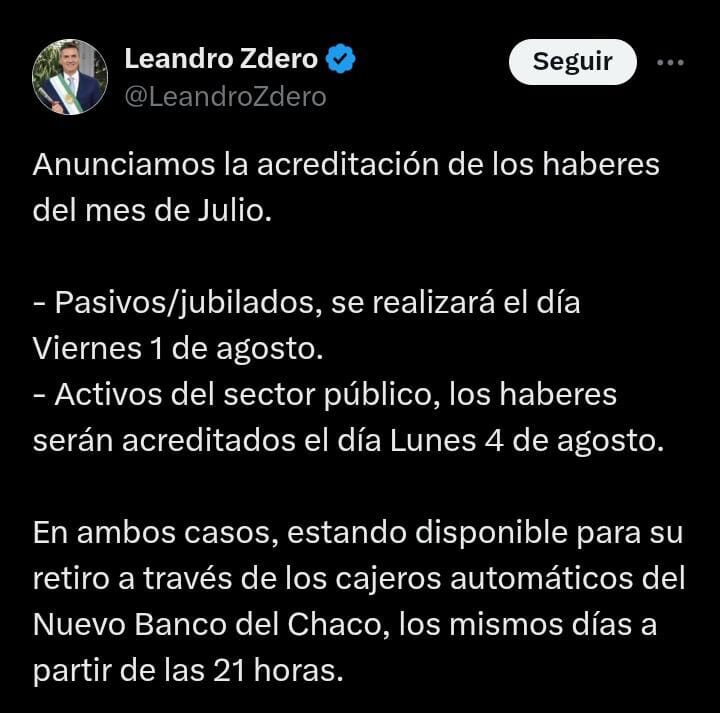 Este jueves, el gobernador Leandro Zdero informó que los haberes correspondientes al mes de julio estarán depositados de acuerdo al siguiente cronograma: