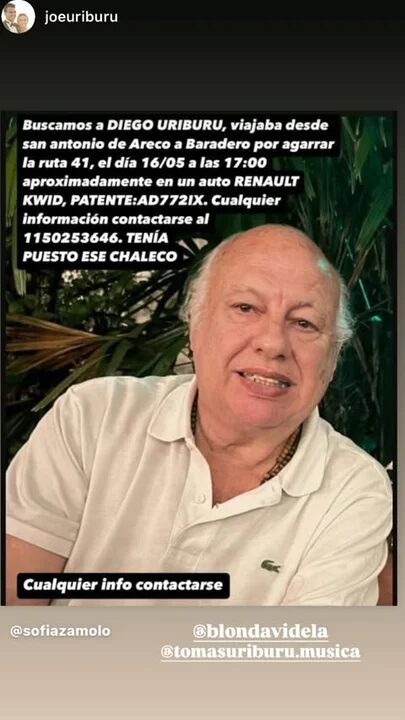 Uriburu fue visto por última vez el 16 de mayo cerca de las 17:00, cuando viajaba desde San Antonio de Areco hacia Baradero en un Renault Kwid patente AD772IX.