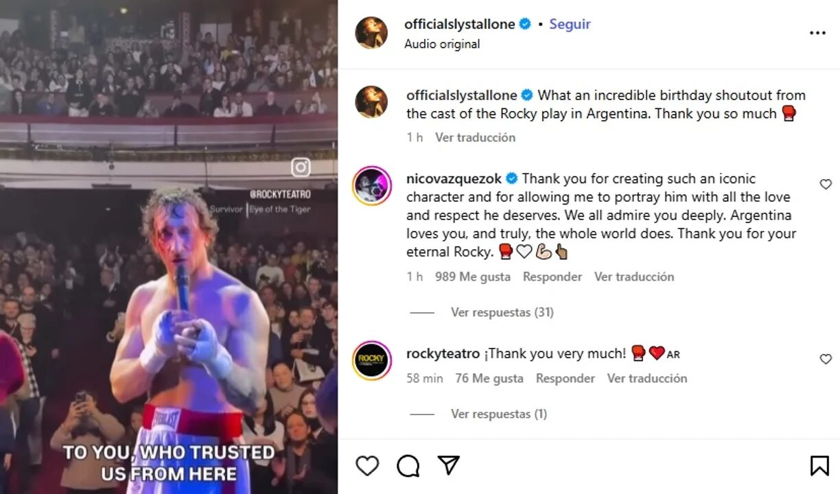 El ídolo de Hollywood celebró así sus 79 años, reconociendo con gratitud el amor recibido desde Argentina. Nico Vázquez, visiblemente emocionado, le respondió con estas palabras: “Gracias por crear un personaje tan icónico y por darme la oportunidad de interpretarlo con todo el amor y el respeto que se merece. Todos te admiramos profundamente. Argentina te ama, y de verdad, el mundo entero también. Gracias por tu Rocky eterno”.