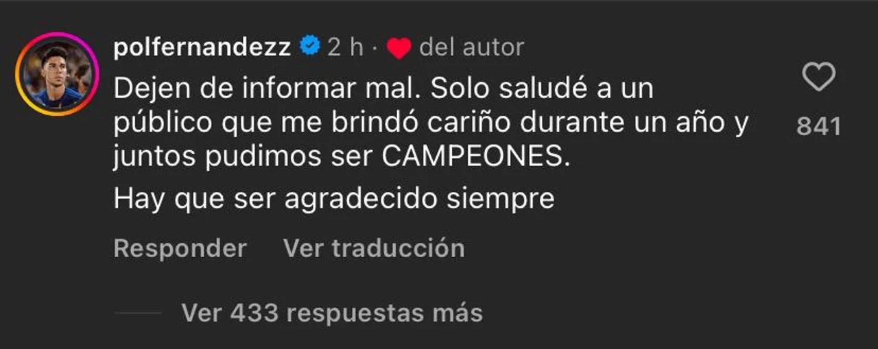 En su posteo, Fernández escribió: «Dejen de informar mal. Solo saludé a un público que me brindó cariño durante un año y juntos pudimos ser campeones. Hay que ser agradecido siempre». El volante, que tuvo un paso destacado por Racing en el pasado, afirmó que el respeto y cariño hacia los hinchas de su exclub fue lo que motivó su gesto, pero aseguró que no tuvo la intención de generar malestar en los fanáticos de Boca.