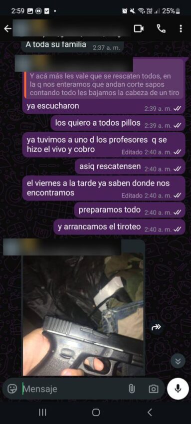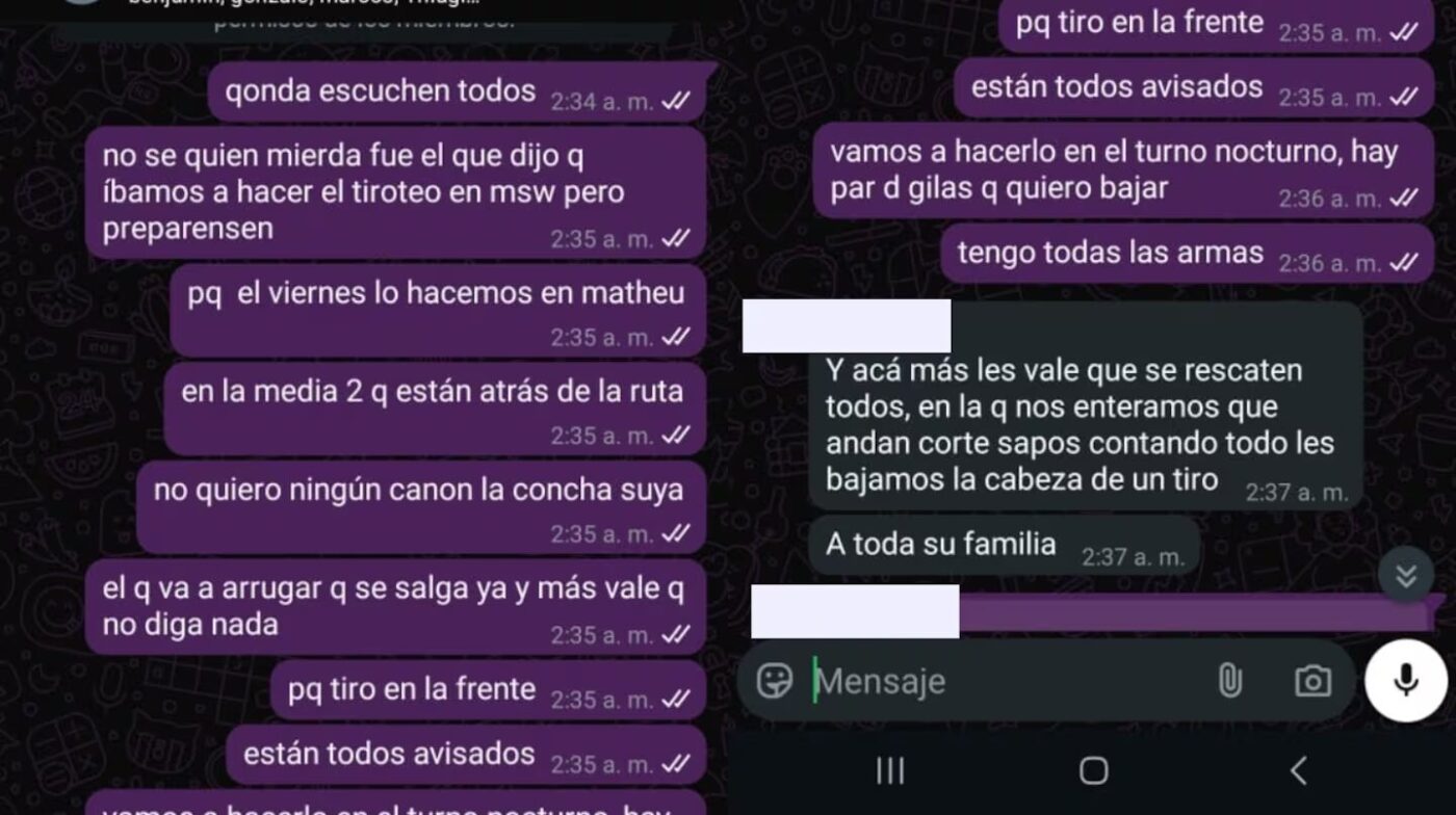 Otro adolescente respondió con más advertencias: “Y acá más les vale que se rescaten todos, en la que nos enteramos de que andan corte sapos, contando todo, les bajamos la cabeza de un tiro a toda su familia”.
