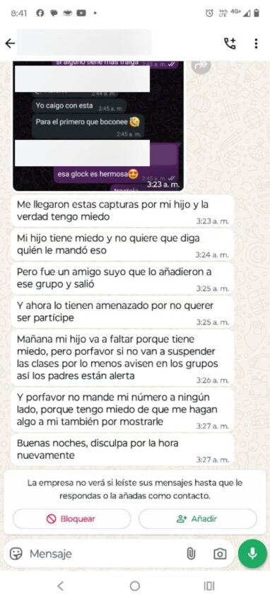 “Me llegaron estas capturas por mi hijo y, la verdad, tengo miedo”, comentó al enviar todas las imágenes. Además, la persona explicó que un amigo de su hijo fue añadido al grupo, pero al ver la conversación, tomó las capturas y abandonó el chat.
