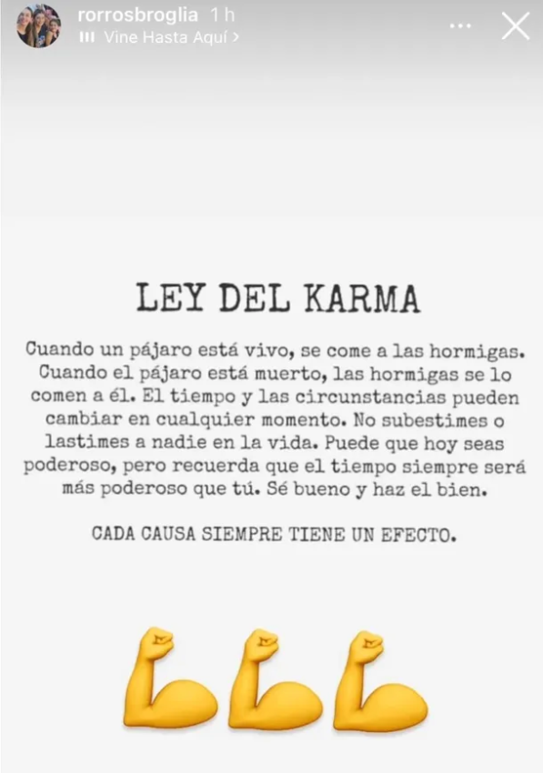 Sin mencionarlo directamente, posteó en su cuenta de Instagram un picante mensaje: «Ley del Karma. Cuando un pájaro está vivo, se come a las hormigas. Cuando el pájaro está muerto, las hormigas se lo comen a él. El tiempo y las circunstancias pueden cambiar en cualquier momento. No subestimes o lastimes a nadie en la vida. Puede que hoy seas poderoso, pero recuerda que el tiempo siempre será más poderoso que tú».