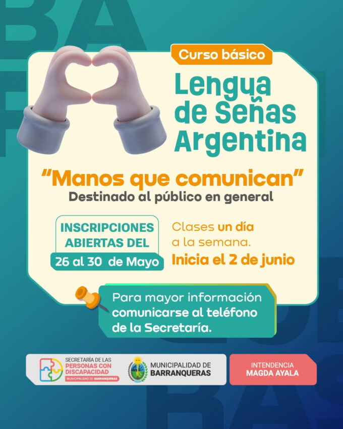 A partir del lunes 26 de mayo, la Municipalidad de Barranqueras abrirá la inscripción para un nuevo curso de Lengua de Señas Argentina (LSA), destinado a todos aquellos interesados en aprender esta importante herramienta de comunicación inclusiva.