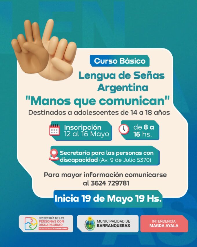 La Intendencia Municipalidad de Barranqueras informa que , se encuentra abierta la inscripción para un nuevo curso de Lengua de Señas Argentina (LSA) destinado a adolescentes desde los 14 años. El curso es totalmente gratuito y se llevará a cabo a partir del 19 de mayo.
