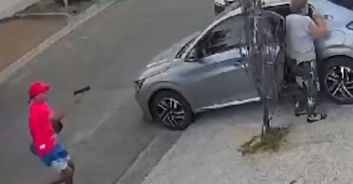 Entonces, uno de los delincuentes, vestido con una remera y gorra roja y una bermuda de jean, bajó de la moto y les apuntó con un arma.
