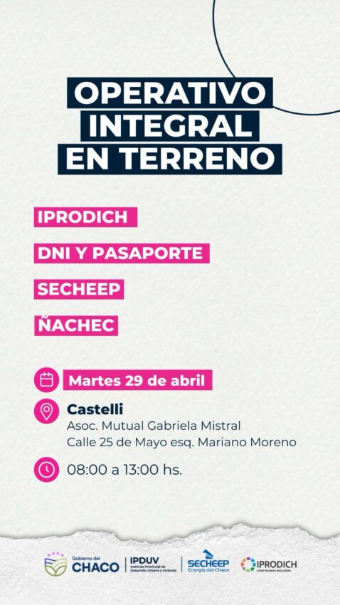 Avanzando con la asistencia a la comunidad, el Operativo Integral en Terreno llevado a cabo por el Gobierno provincial llegará este martes 29 y miércoles 30 de abril a Juan José Castelli y Tres Isletas, con el objetivo de acercar a la comunidad distintos organismos para brindar asesoramiento y facilitar trámites esenciales.