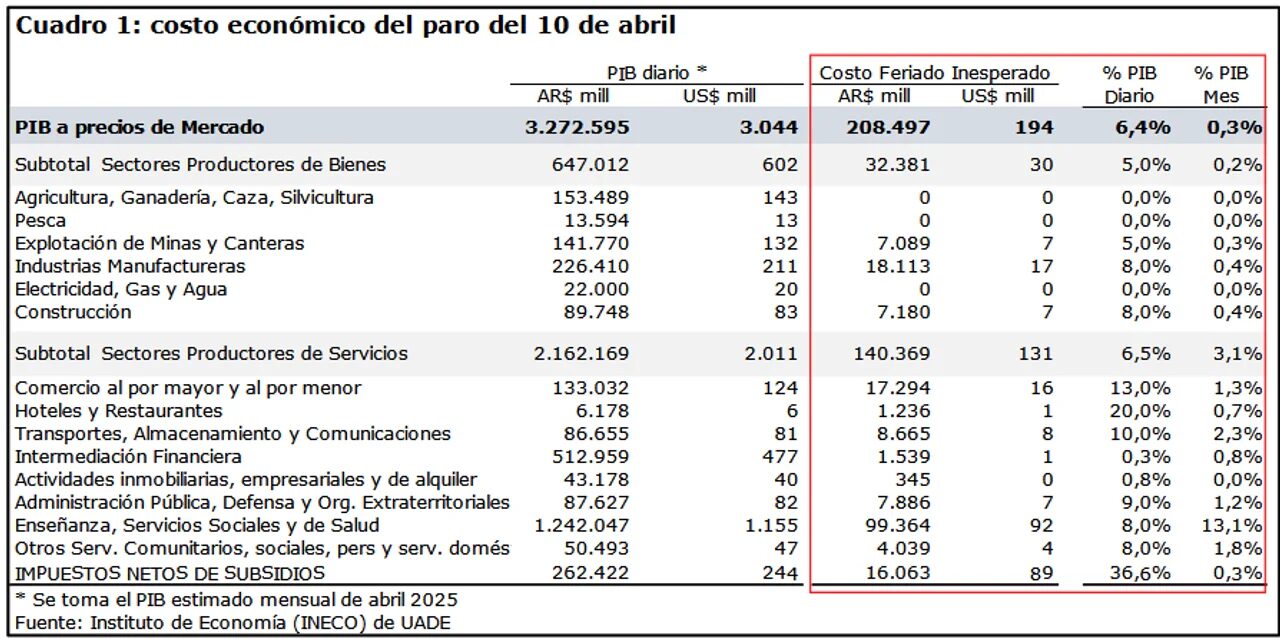 Según la estimación preliminar del Instituto de Economía de UADE, el costo económico que implica el paro del 10 de abril de 2025 es de $208.497