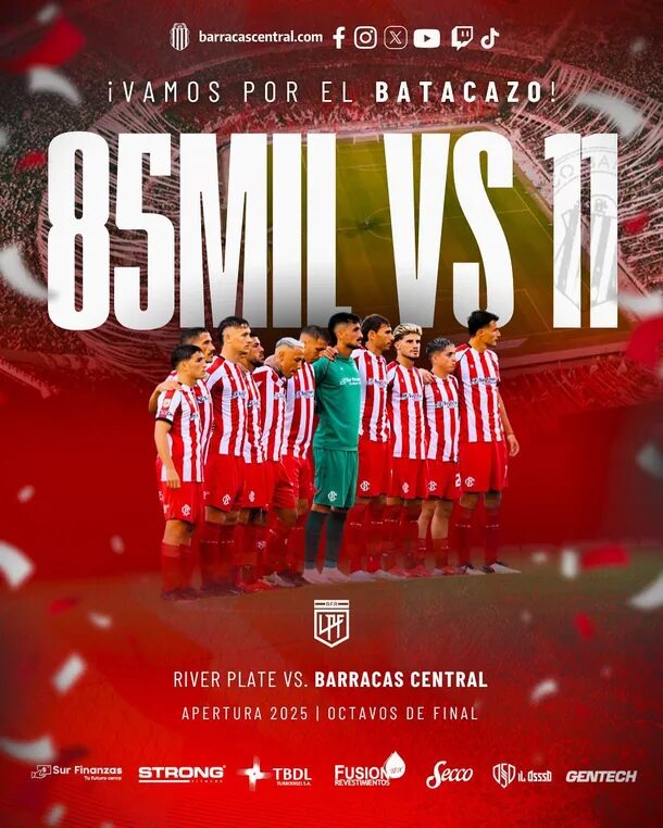 “¡VAMOS POR EL BATACAZO! ¡85 MIL VS 11!”, fue el texto publicado junto a una imagen del plantel, aludiendo a la enorme cantidad de hinchas que tendrá el equipo de Marcelo Gallardo como local en Núñez. El mensaje, lejos de achicarse ante el contexto, reflejó la ilusión de Barracas de dar el golpe y eliminar a uno de los máximos candidatos al título en una comptencia que está más apasionante que nunca y que está llegando a la parte final.