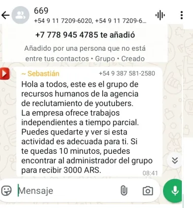 El mensaje textualmente dice: «Hola a todos este es el grupo de recursos humanos de la agencia de reclutamiento de youtubers. La empresa ofrece trabajos independientes a tiempo parcial. Puedes quedarte y ver si esta actividad es adecuada para ti. Si te quedas 10 minutos, puedes encontrar al administrador del grupo para recibir $3.000», se presentó a las 8.40.