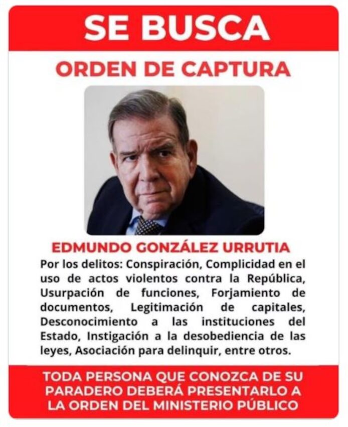 En un mensaje divulgado en las redes sociales, la fiscalía venezolana dijo que González Urrutia se lo busca por “conspiración, complicidad en el uso de actos violentos contra la República, usurpación de funciones, forjamiento de documentos, legitimación de capitales, desconocimiento a las instituciones del Estado, instigación a la desobediencia de las leyes y asociación para delinquir, entre otros”.