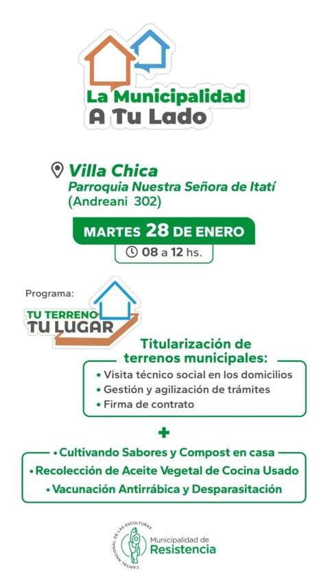 El programa «La Municipalidad a tu Lado» estará este martes 28 de enero en la Parroquia Nuestra Señora de Itatí de Villa Chica, sita en calle Andreani 302, de 8 a 12 horas. El miércoles 29, en el mismo horario, la propuesta descentralizadora comunal se presentará en la Fundación Conin, avenida Lavalle entre calles 15 y 16.