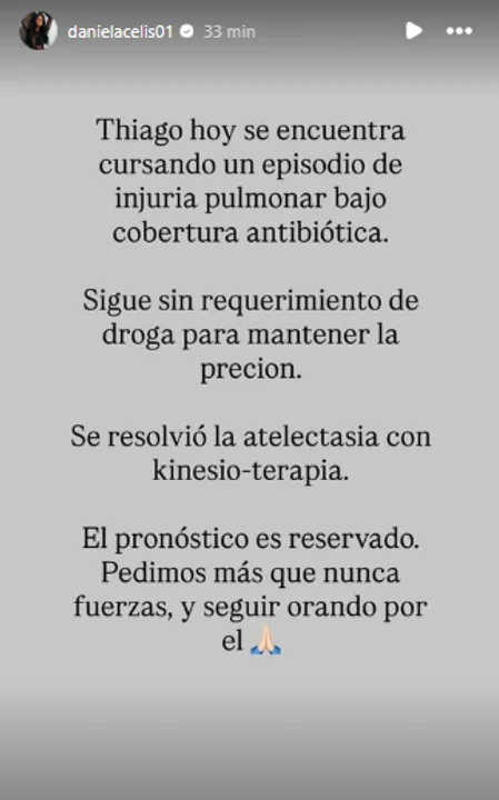 Asimismo, la madre de las hijas de Thiago y también ex participante de Gran Hermano, reveló que Medina continúa “sin requerimiento de drogas para mantener la presión». Al tiempo en que destacó la evolución de su salud.