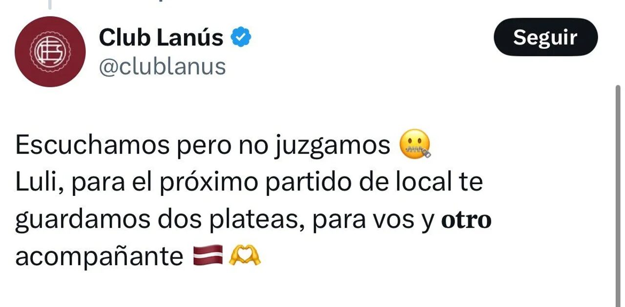 Desde la cuenta oficial en X de Lanús se enteraron de lo ocurrido y decidieron hacerle un gran regalo: “Escuchamos pero no juzgamos. Luli, para el próximo partido de local te guardamos dos plateas, para vos y otro acompañante”.