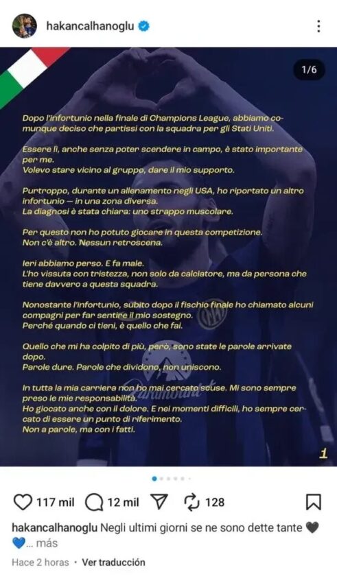 En medio de esta tensión creciente, el propio Calhanoglu eligió responder de forma indirecta pero contundente a través de su cuenta de Instagram. “Respeto todas las opiniones, incluso las de un compañero, incluso las del presidente del club. Nunca he traicionado esta camiseta. La historia siempre recuerda a los que se mantuvieron firmes, no a los que gritaron más fuerte”, escribió en lo que fue leído como una réplica directa al delantero argentino.