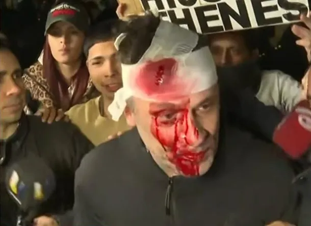 En ese contexto, el periodista Cristian Mercatante fue severamente agredido por un botellazo que le revolearon en las inmediaciones al Club Villa Ángela, donde el Presidente lleva a cabo un enérgico discurso. Con la cara ensangrentada, el comunicador -que expresó trabajar para «Desayuno Americano» (América)- contó que no vio venir el elemento que lo dejó seriamente herido: «Estaba cubriendo para mi programa», señaló.