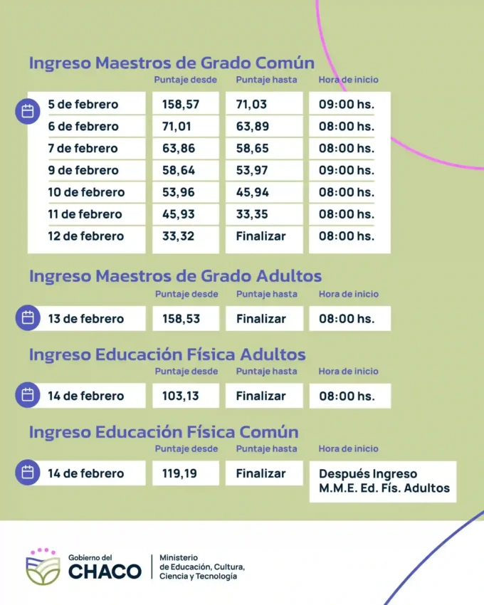 Según el cronograma oficial, los ofrecimientos se realizarán de la siguiente manera: el 2 y 3 de febrero se llevará a cabo el Traslado Definitivo para Maestros de Grado; el 3 de febrero, por la tarde, será el turno del Traslado Definitivo para Maestros de Grado Adultos y Educación Física; el Ingreso para Maestros de Grado de Educación Primaria Común se desarrollará los días 5, 6, 7, 9, 10, 11 y 12 de febrero, por orden de puntajes; el 13 de febrero se realizará el ofrecimiento de cargos para Maestros de Grado Adultos y el 14 de febrero para Educación Física.