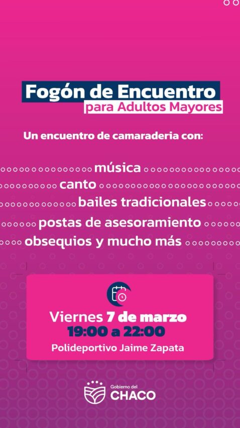 En el Polideportivo Jaime Zapata, predio del Instituto del Deporte Chaqueño, se desarrollará mañana viernes una actividad denominada “Fogón de Encuentro” destinada a adultos mayores que que compartieron las jornadas realizadas en temporada veraniega. El evento dará comienzo a las 19 Hs y estará organizado por el mencionado organismo en forma conjunta con el Ministerio de Desarrollo Humano, Lotería Chaqueña, Instituto de Cultura y Subsecretaría de Niñez, Adolescencia, Familia y Adultos.