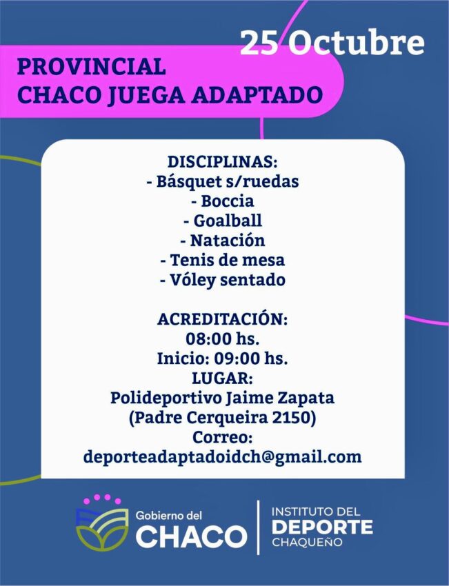 Este viernes 25 de octubre, se realizará en las instalaciones del Polideportivo Jaime Zapata la gran final provincial del programa *Chaco Juega Adaptado* que promueve el Gobierno de la provincia a través del Instituto del Deporte Chaqueño.