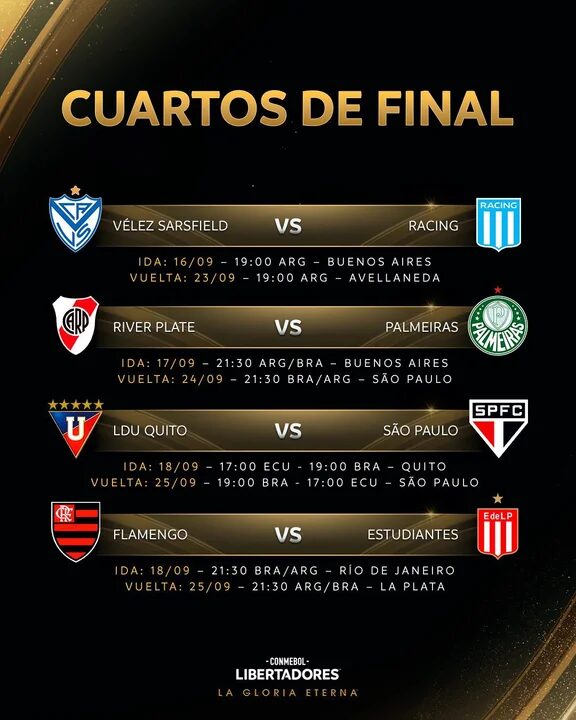 La Conmebol confirmó el cronograma de los cuartos de final de la Copa Libertadores, que se disputarán entre el 16 y el 25 de septiembre.
