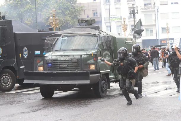 Un camión hidrante de esa fuerza avanzaba por la vía pública contra los manifestantes y el agente que lo manejaba lanzó una peligrosa frase por megáfono: «¡Vengan, zurdos!», haciendo honor a una de las frases preferidas del presidente Javier Milei.