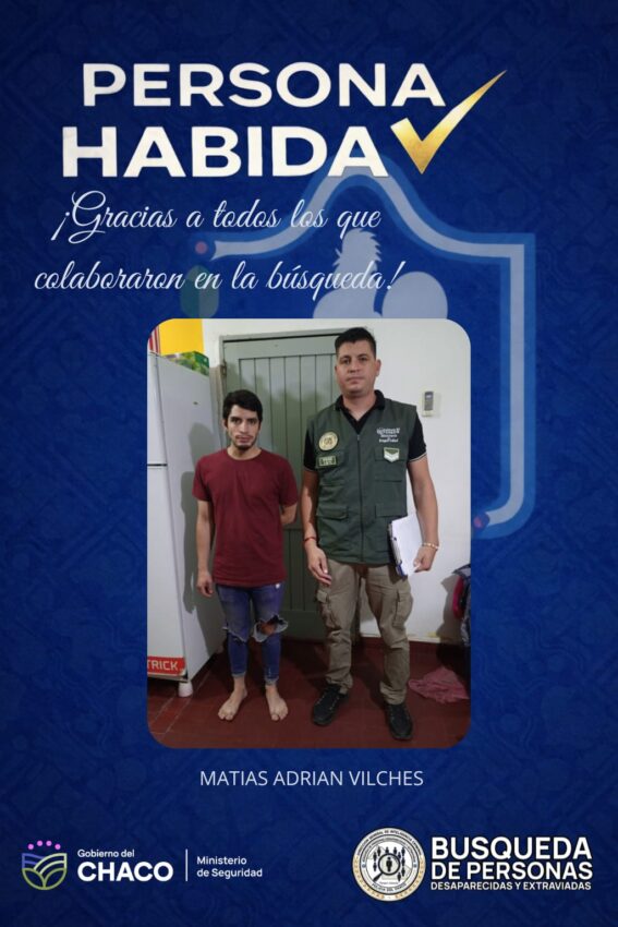 La Policía del Chaco informó que fue localizado Matías Adrián Vilchez (30), quien había sido reportado como desaparecido en Barranqueras.
