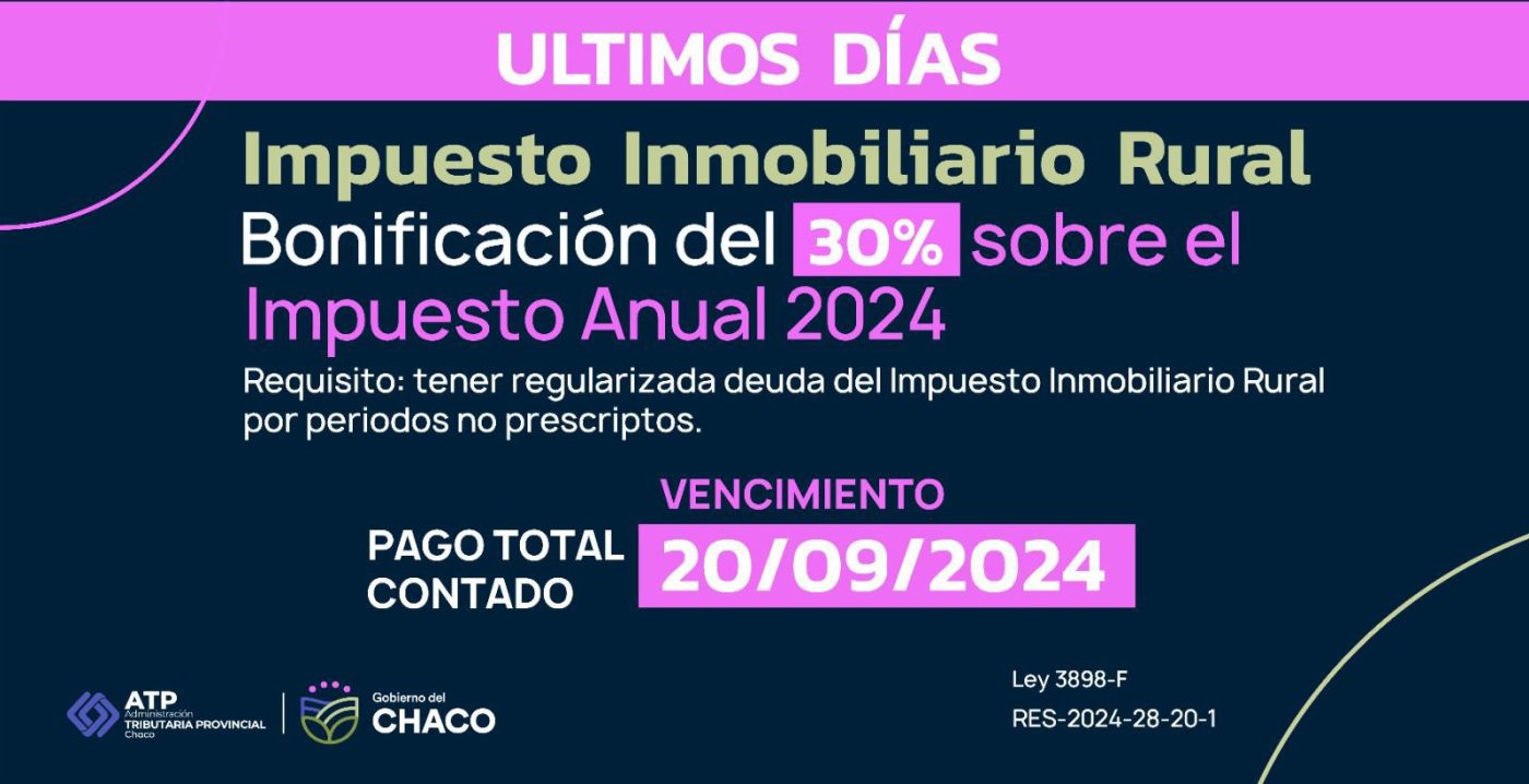 Mediante la Resolución General N° 2024-28-20-1 la ATP estableció el calendario del Impuesto Inmobiliario Rural correspondiente al año 2024, al cual se puede acceder ingresando a la web: atp.chaco.gob.ar :