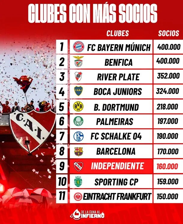 El club comunicó la noticia a través de su área de prensa: «En las últimas horas, se dio de alta en el registro de socios al Sr. Jorge Rodrigo Ibáñez con el número de socio 160.000», revelaron en un comunicado. Cabe recordar que, según un ranking publicado meses atrás por la página especializada Transfermarkt, Independiente ya se encontraba dentro del selecto grupo de los diez clubes con más socios a nivel mundial.