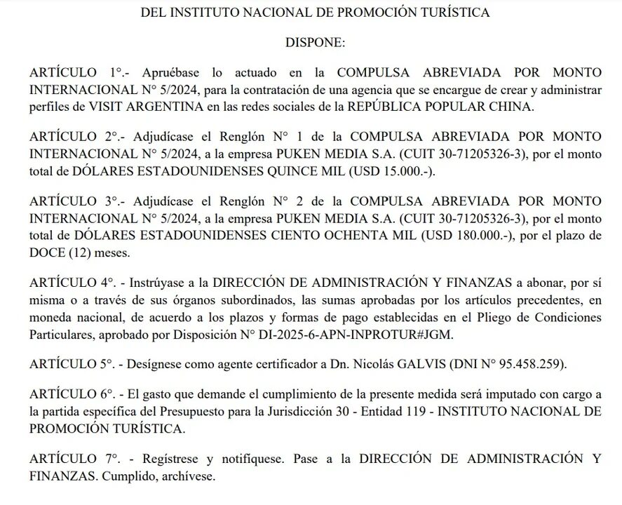 El Instituto Nacional de Promoción Turística (INPROTUR), organismo dependiente de la Jefatura de Gabinete de Ministros, adjudicó un contrato por USD 195.000 para la creación y administración de perfiles de redes sociales de «Visit Argentina» en la República Popular China. La contratación recayó en la empresa Puken Media S.A., lo que equivale a aproximadamente $238.875.000 según la cotización de $1.225 por dólar.