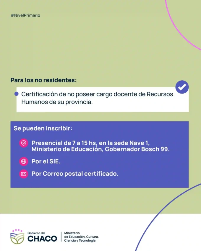 En el caso de personas no residentes en la provincia, deberán presentar además una certificación de Recursos Humanos de su jurisdicción que acredite no poseer cargo docente.