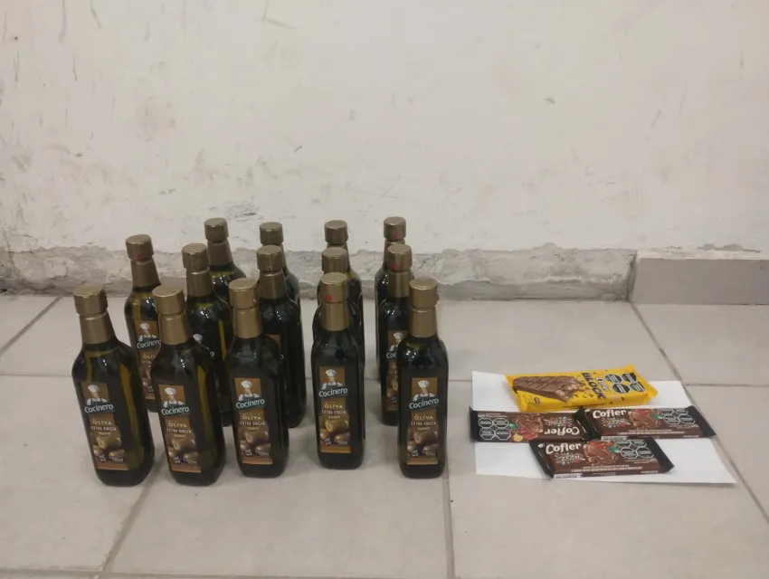 Tras un seguimiento discreto, los agentes de seguridad constataron que la mujer tenía escondidos entre sus prendas 14 botellas de aceite de oliva de primera marca, además de cuatro barras de chocolate, una con maní y tres con rocklets. La pareja intentó abandonar el lugar sin abonar los productos, pero fueron interceptados en la zona de salida del establecimiento.