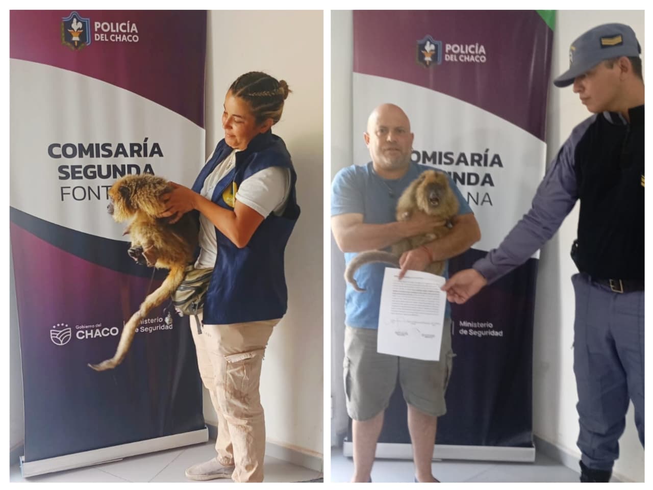 En una primera intervención, vecinos alertaron sobre la presencia del animal en el patio de una vivienda. Al arribar al lugar, los efectivos constataron que se trataba de un mono aullador hembra, con una lesión antigua en una de sus extremidades, por lo que fue trasladado preventivamente a la guardia policial. Tras dar intervención a los organismos correspondientes, se estableció que el animal se encontraba bajo el cuidado de un médico veterinario, procediéndose conforme a las directivas impartidas.