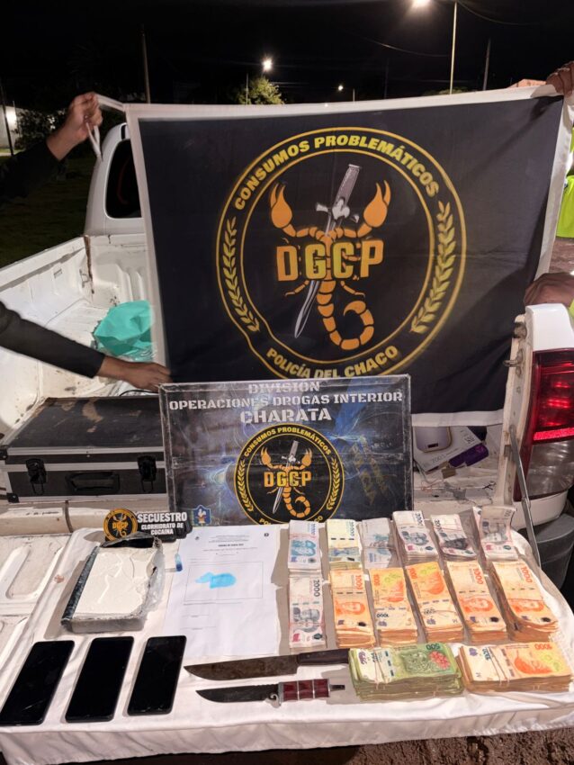 En el procedimiento secuestraron un paquete con 1.033 gramos de cocaína, tres teléfonos celulares, $5.486.850 en efectivo, dos cuchillos y un automóvil Volkswagen Vento.