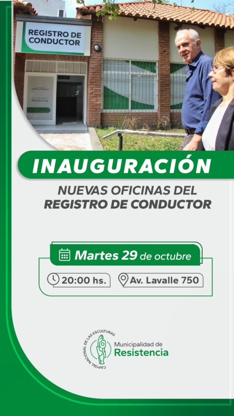 La Municipalidad de Resistencia invita a la comunidad al acto inaugural de las oficinas de Registro de Conductor, a realizarse este martes 29 de octubre, a partir de las 20 horas, sobre avenida Lavalle 750, en el Parque Intercultural «2 de Febrero».