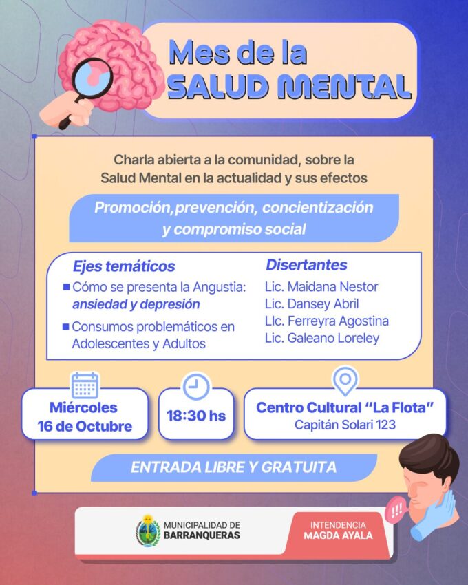 En el marco del Mes de la Salud Mental, la municipalidad de Barranqueras invita a participar de una charla de concientización sobre la salud mental en la actualidad y sus efectos.