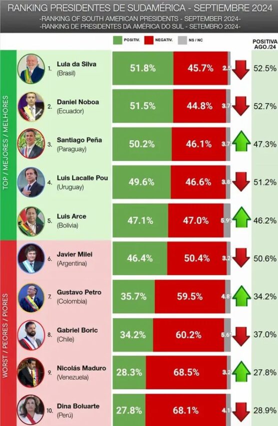 Según los resultados, los tres presidentes mejor valoración a nivel regional en septiembre de 2024 son: Lula da Silva de Brasil, con un 51,8% de imagen positiva; lo sigue el ecuatoriano Daniel Noboa, con un 51,5%; y Santiago Peña de Paraguay, con un 50,2%.