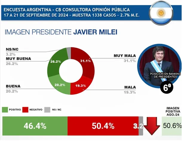 En cuanto a las variaciones intermensuales, el presidente que más creció en septiembre comparado con el mes anterior fue el paraguayo Santiago Peña (+2,9%), mientras que el presidente argentino fue quien más cayó, alcanzando un +4,2%.Para el 19,3% de los encuestados la imagen del libertario es «mala», mientras que para un 31,1% es «muy mala», el 20,2% calificó de «muy buena» y el 26,2% de «muy buena».