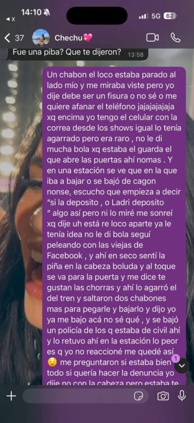 «El loco estaba parado al lado mío y me miraba, viste, pero yo dije ‘debe ser un fisura o no sé o me quiere afanar el teléfono'», comenzó relatando la joven. Y continuó: «Escucho que empieza a decir ‘si la depósito, o Ladri depósito’, algo así pero ni lo miré. Y ahí en seco sentí la piña en la cabeza, y al toque se va para la puerta y me dice ‘te gustan las chorras’ y ahí lo agarró el del tren y saltaron dos chabones mas para pegarle y bajarlo y dijo ‘yo ya me bajo acá'».