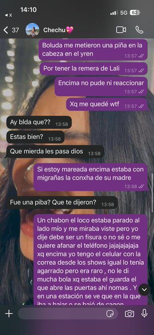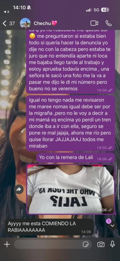 “Me pegaron una trompada en el tren por usar una remera de Lali”, escribió la usuaria @laliiloveshe. Tras la repercusión, la chica publicó unos chats de WhatsApp relatando lo sucedido.