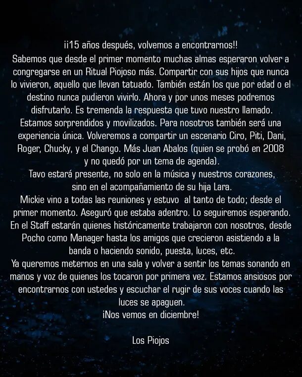Finalmente, cerraron: «Estamos ansiosos por encontrarnos con ustedes y escuchar el rugir de sus voces cuando las luces se apaguen. ¡Nos vemos en diciembre! Los Piojos».
