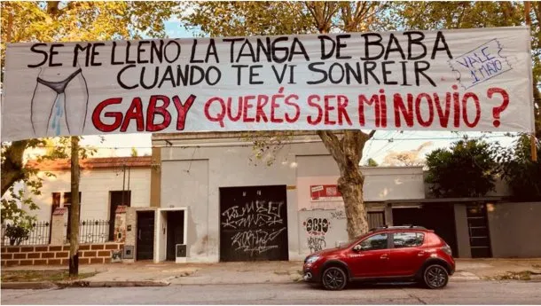«Se me llenó la tanga de baba cuando te vi sonreír. Gaby, ¿querés ser mi novio? Vale hasta el 1 de mayo», es el mensaje con el que Vanesa decidió romper el hielo. La puesta en escena causó curiosidad entre vecinos y no faltaron las críticas, pero en redes sociales se volvió viral.