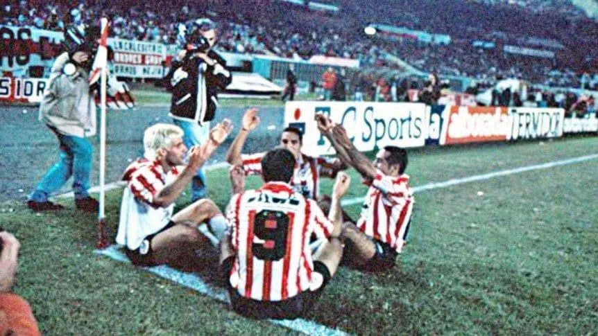 Junto a sus compañeros, entre los que estaba Lionel Scaloni, el ídolo de Boca protagonizó una particular celebración tras convertirle un gol al Millonario con Estudiantes en el Monumental.