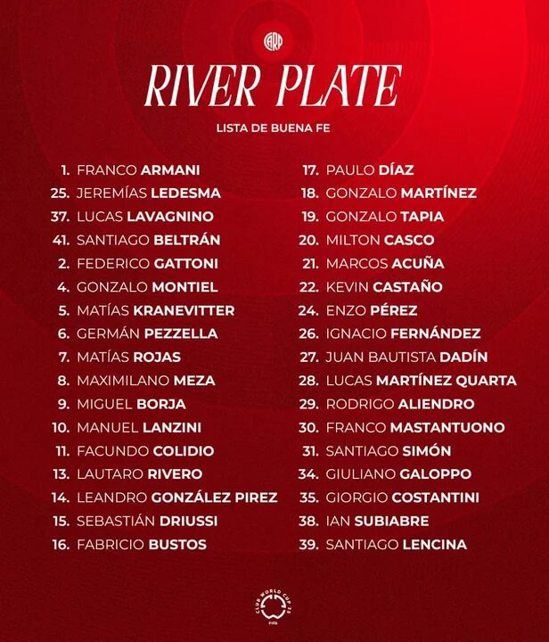 El “Millonario” reveló quienes son los 39 jugadores que tendrá a disposición el director técnico Marcelo Daniel Gallardo de cara a la competición más importante de todo este 2025. En el listado estuvo incluido Franco Mastantuono, quien está vendido al Real Madrid, pero disputará el certamen internacional.