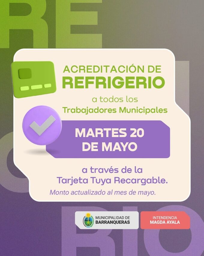 La Municipalidad de Barranqueras informa a todo el personal municipal que el próximo martes 20 de mayo se realizará la acreditación del concepto de refrigerio, correspondiente al mes en curso.