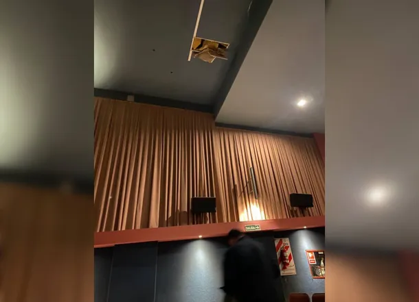 Testigos de la secuencia aportaron videos del momento en que tuvieron que ser evacuados de la sala porque no se puedo seguir con la función, que acababa de arrancar cuando se cayó el techo por motivos que todavía no fueron esclarecidos.