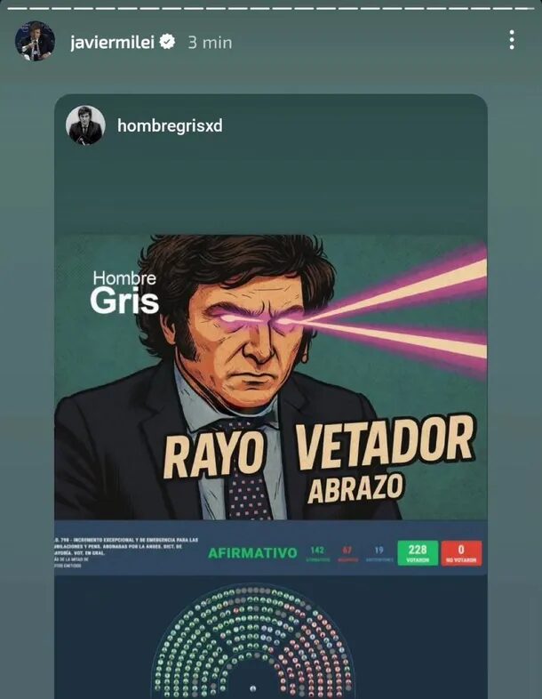 Tras lanzar un contundente mensaje en redes sociales donde anticipa su veto a «cualquier cosa que atente contra el déficit cero», el Presidente dedicó horas de la medianoche y madrugada a compartir los posteos de sus trolls. Uno de ellos llamó poderosamente la atención, dado que se trataba de una caricatura del primer mandatario con la leyenda «rayo vetador», a modo de burla.