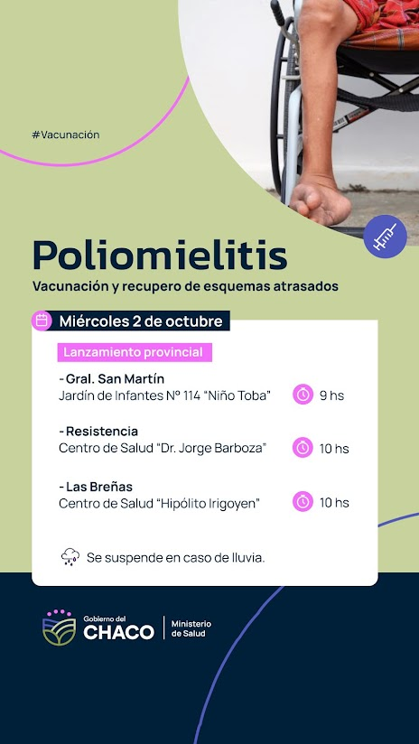 Este miércoles 2 de octubre se realizará el lanzamiento en toda la provincia de la campaña de vacunación y recupero de esquemas atrasados contra la Poliomielitis.
