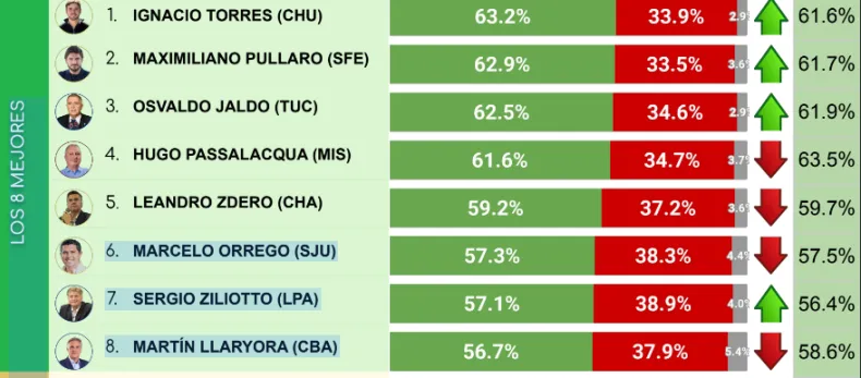 El sondeo muestra que el 25,6% de los consultados tiene una imagen «muy buena» del gobernador, mientras que el 33,6% lo califica como «bueno». Por otro lado, un 23,9% considera su gestión como «mala» y un 13,3% la valora como «muy mala». Solo el 3,6% no expresó una opinión al respecto.