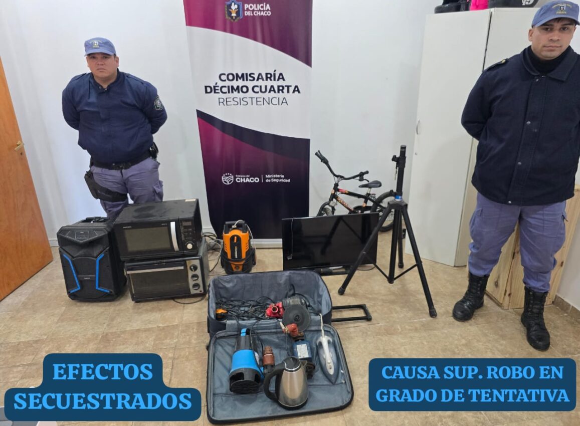 Rápidamente, el personal llego al lugar y vieron a un sujeto que salía con varios elementos en sus manos, como asimismo tenia acopiados a unos metros, otros bienes. Pero al ver el patrullero, intento huir siendo demorado a unos metros.