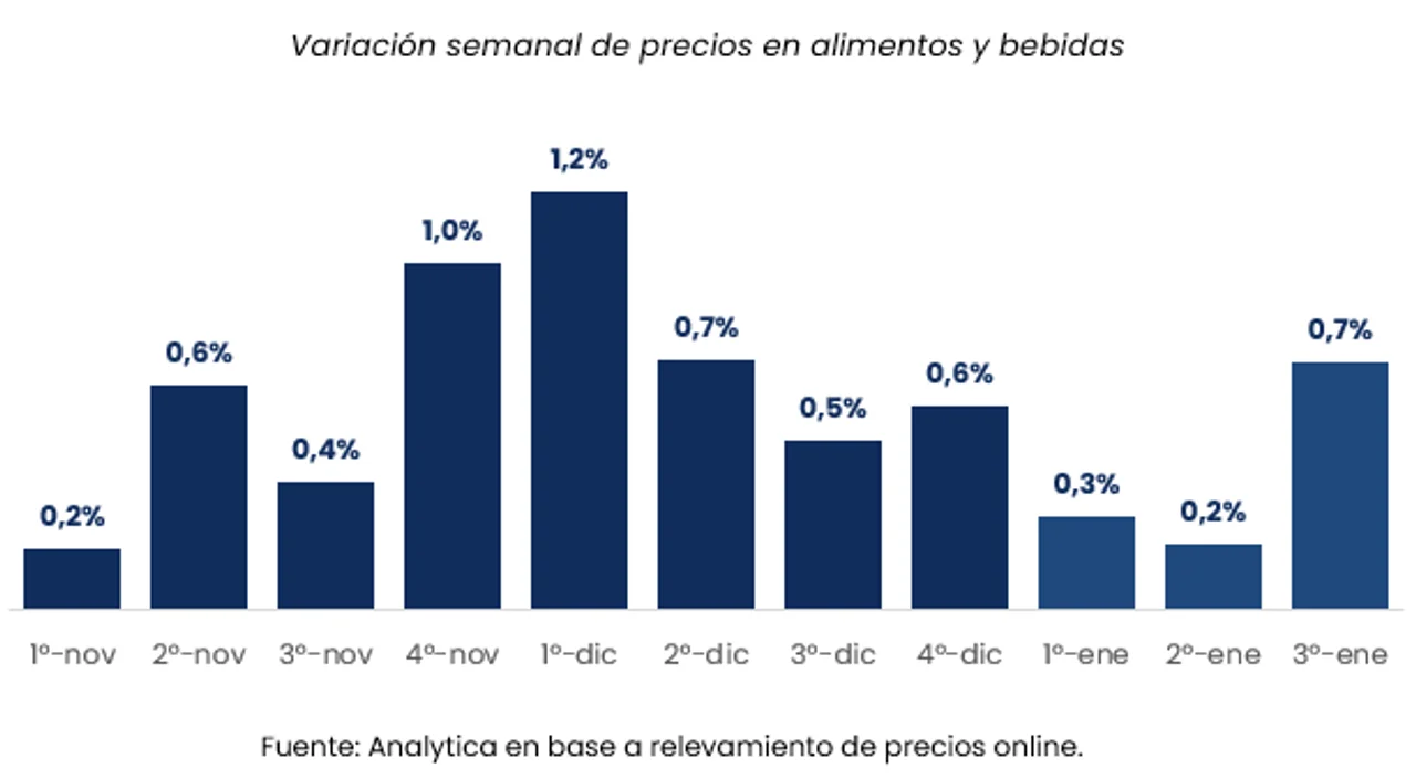 Los precios de los alimentos y bebidas acumularon un alza del 2,1% en las primeras tres semanas del año, según el relevamiento de la consultora Analytica.